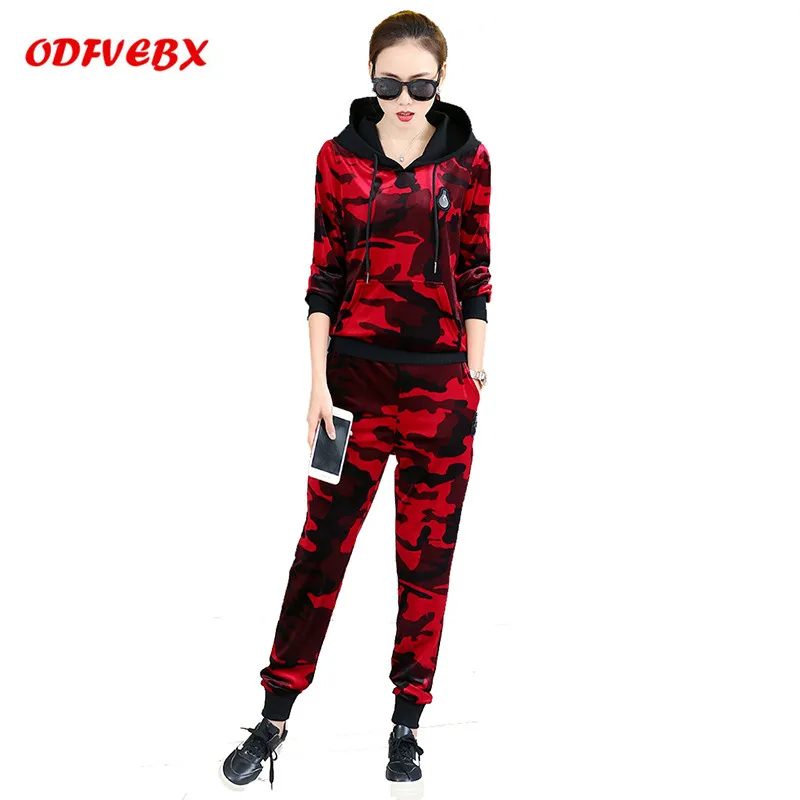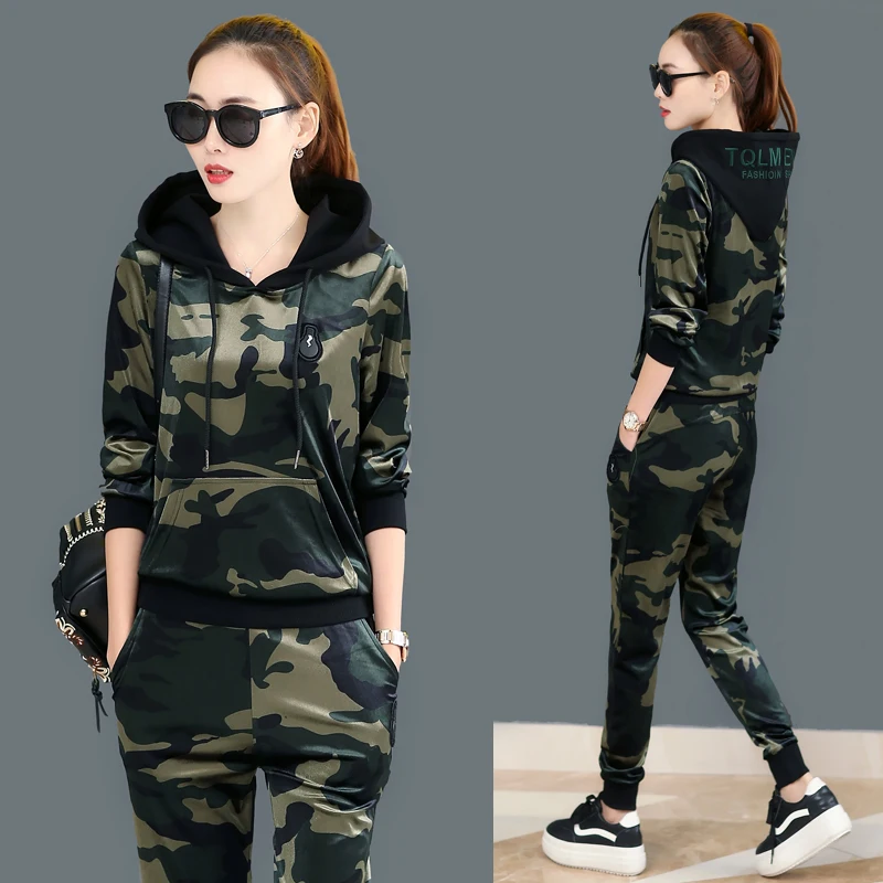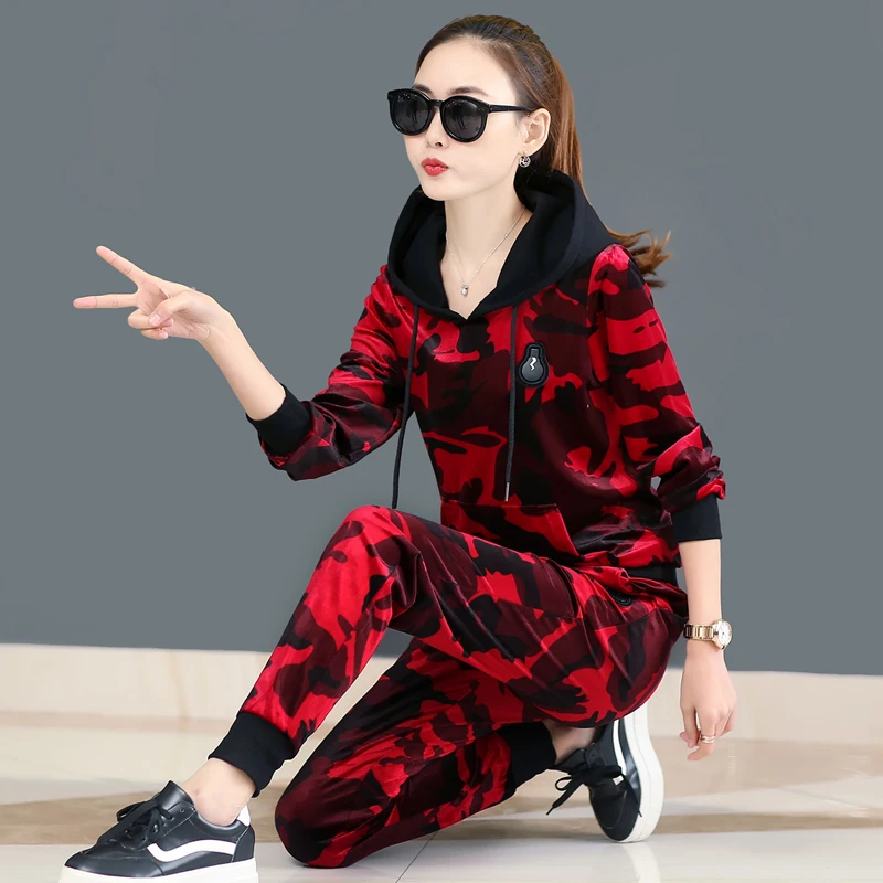 BEST 2020 new spring Female camouflage sportswear suit female long-sleeved fashion large size gold velve